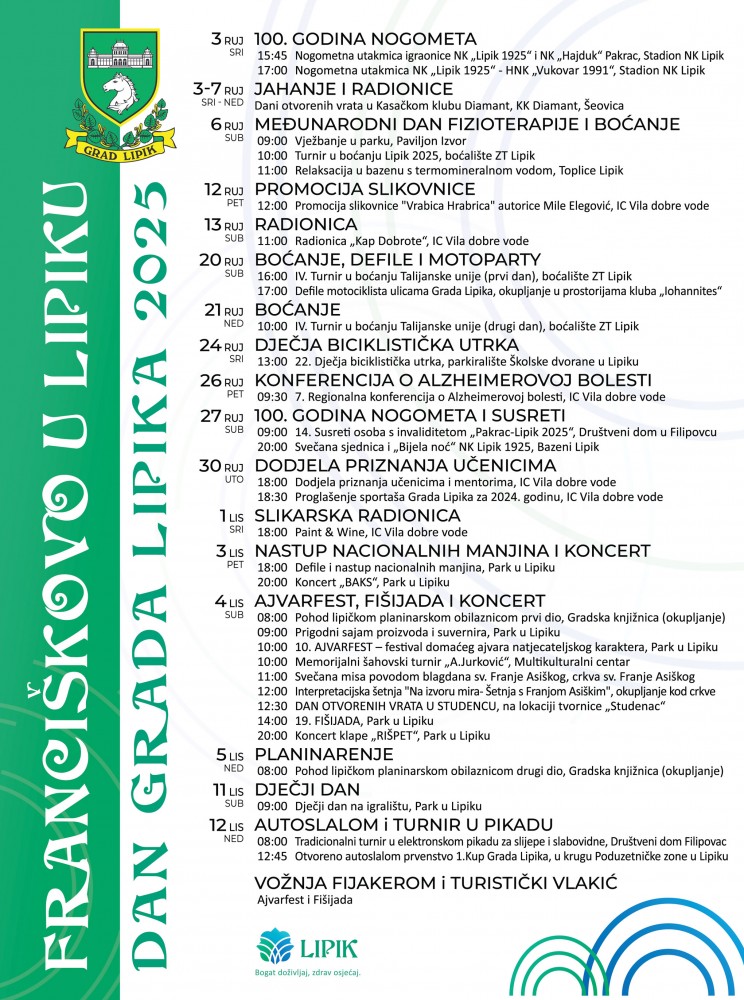 U rujnu tradicionalno obilježavamo Dan Grada Lipika pred blagdan sv. Franje Asiškog 4. listopada, a sve poznanike i prijatelje pozivamo na mnoštvo manifestacija povodom obilježavanja Dan grada Lipika.
