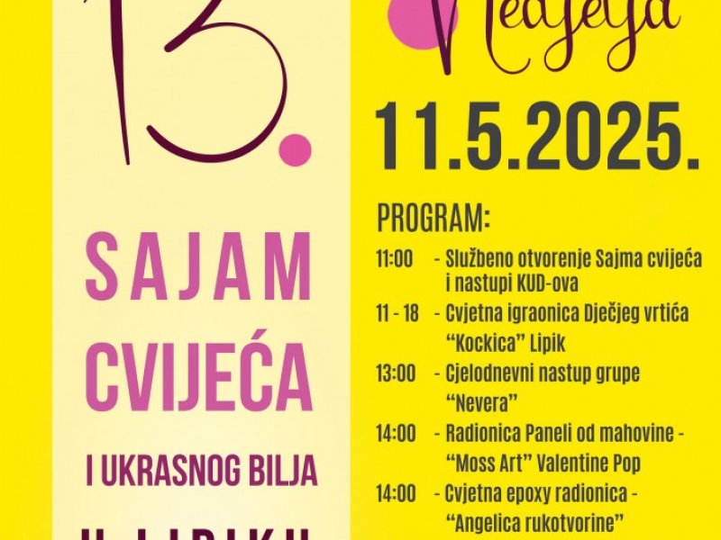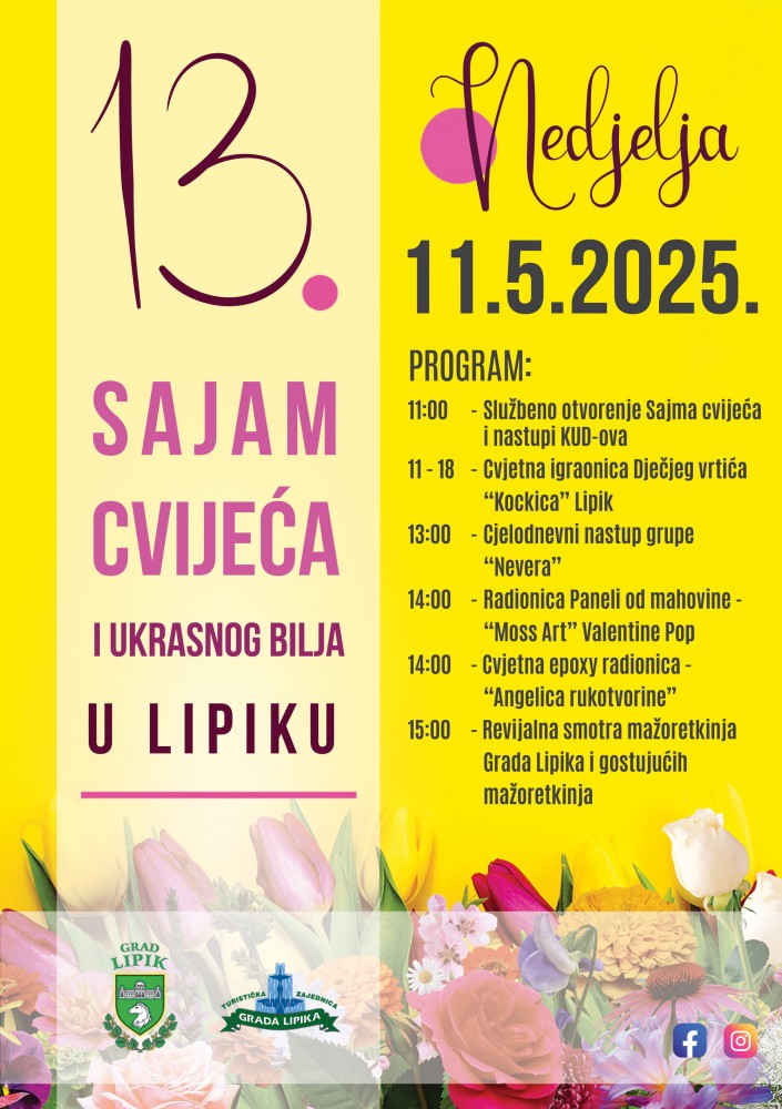 Zato zabilježite datum – subota, 11. svibnja 2025. – i dođite u Lipik! Čeka vas dan ispunjen mirisima, okusima, glazbom i osmijesima. Vidimo se na Sajmu cvijeća – neka cvjeta prijateljstvo, kreativnost i dobro raspoloženje!
