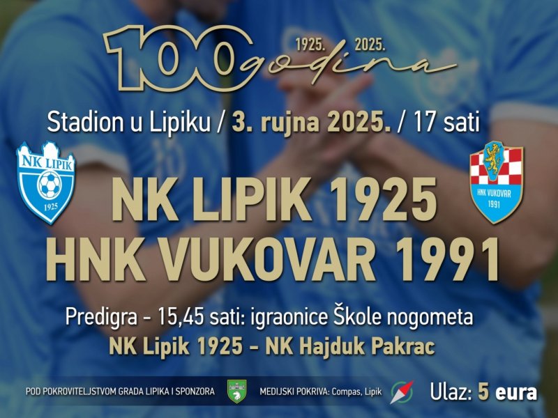 Kao što je poznato, nogometni klub Lipik 1925 ove godine slavi stotinu godina postojanja, a početak proslave ovog vrijednog jubileja bit će u srijedu, 3. rujna, na stadionu u Lipiku. Prvi od ukupno dva dana programa donosi sportska događanja, s fokusom na prijateljsku utakmicu domaćina i prvoligaša HNK Vukovar 1991. Krajem mjeseca, preciznije 27. rujna, bit će organizirana svečana skupština kluba, a u nastavku večeri i „Bijela noć“…