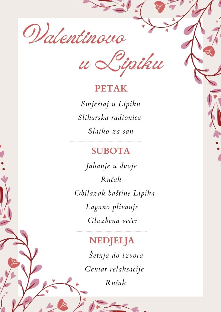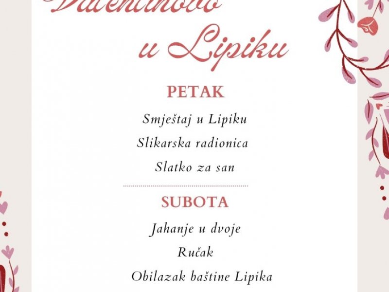 U subotu prvo isplanirajte kupovinu cvijeća u cvjećarni "Helena" koju ćete pokloniti uz jutarnju kavu. Pa onda zajedno krenite s aktivnostima. Organizirano je planinarenje poznatom ljubavnom stazom od 9 sati i možete jahati na ranču Kasačkog kluba „Diamant“ koji ima posebnu vikend ponudu jahanja u dvoje gdje možete i obići 40-tak konja cijeli dan. Nakon toga predlažemo ručak u toplom ambijentu restorana „Nada“ s prigodnom listom pića.