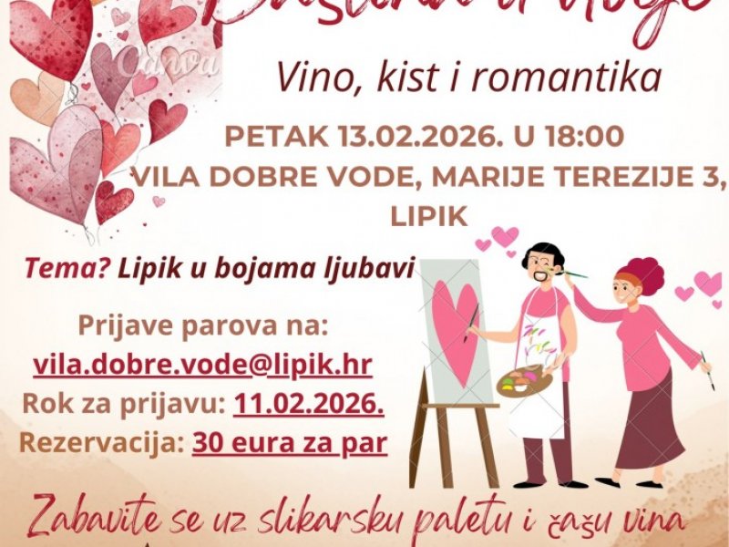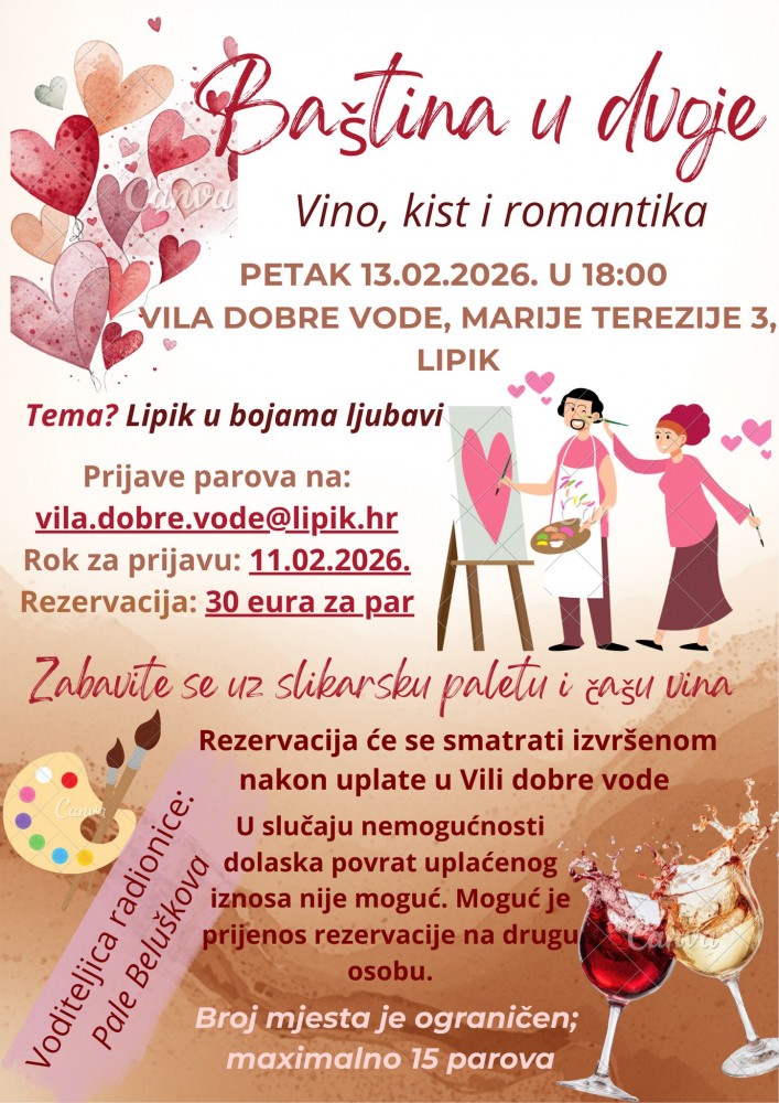 Predlažemo Vam dolazak u petak na smještaj pa na slikarsku radionicu „Baština u dvoje“, poslije čega večer možete završiti uz domaći kolač i desert u istom objektu.